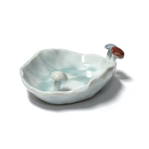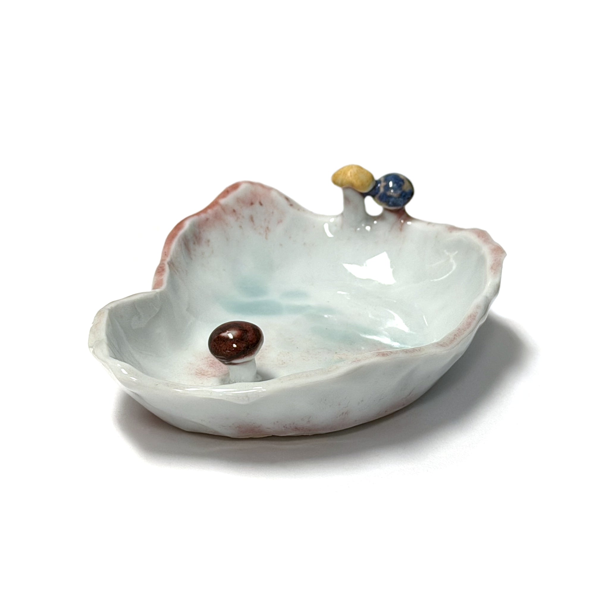 Each tray is individually crafted by hand using porcelain, making every piece wonderfully unique. These charming trinket trays measure between 4-4.5" long and about 3" wide, perfect for rings or other small items. The natural color variations you'll notice are a beautiful testament to their handmade origin—no two vases are exactly alike, celebrating the artistry of Aya McDaniel's work.