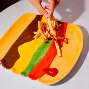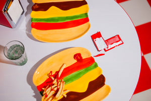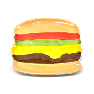 This ceramic plate, crafted in the shape of a cheeseburger, captures the classic look of 1950s diner and fast-food imagery. It’s a charming way to add a nostalgic, tasty touch to your home or kitchen.