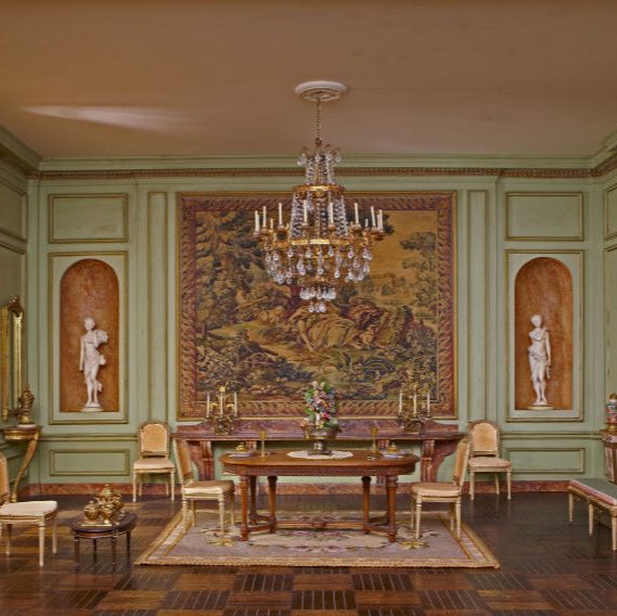 Beginning in 1930, Thorne commissioned interiors scenes to contain her growing collection of miniature objects. At their tiny scale, some of the rooms even contain period-style rugs Thorne had woven specifically for each space. Thorne and the craftsmen with whom she worked completed nearly 100 rooms. Her hope was that perfectly proportioned rooms in miniature could substitute for costly and space-consuming full-scale period rooms that museums across the country were beginning to acquire. They also reflect the architectural revivals popular amongst wealthy patrons for their homes, and publicized in the shelter magazines of the period.