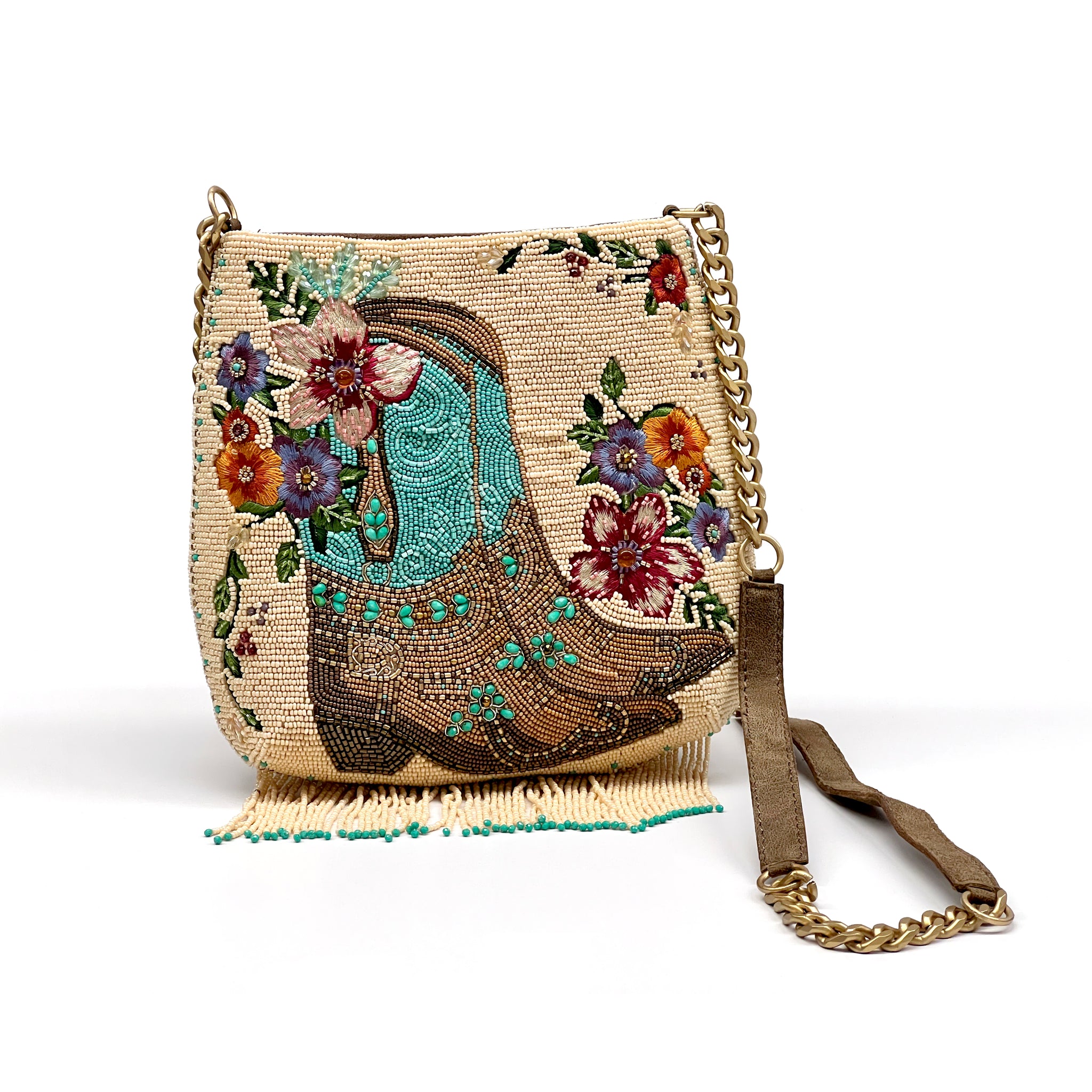 Celebrate the lively spirit of country dance with this Mary Frances Line Dance Beaded Crossbody Bag. Featuring intricately beaded cowgirl boots adorned with colorful flowers, its playful fringe moves with you as you walk. Designed for convenience, the bag includes a non-removable leather and chain crossbody strap, a magnetic closure, and multiple pockets to keep essentials organized.