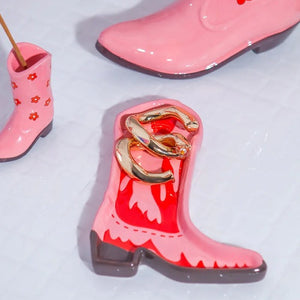 This ceramic trinket tray, crafted in the shape of a cowboy boot, adds a lively touch of Western charm to your decor. Its playful and unique design is perfect for keeping small items organized with a bit of spirited flair. Yee-Haw!