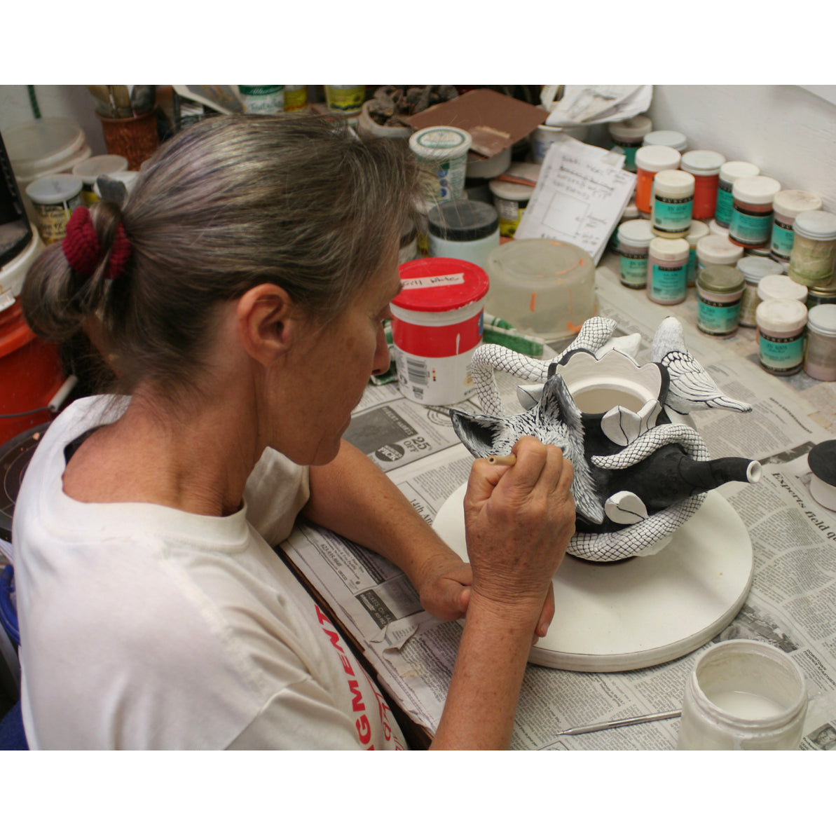 Farraday Newsome is a ceramic artist who creates elaborately glazed terra cotta pottery and sculptures. Her subject matter is primarily drawn from nature, often referring to the emotional and metaphorical allusions found in the natural world. Newsome has worked within the format of the vessel for forty years, exploring ideas of abundance, time, and fertility. Newsome grew up in the redwood forests of California, earning her BA in Biology from the University of California at Santa Cruz and her Masters in Art with a Ceramics Emphasis at San Francisco State University. She lives in Mesa, Arizona, sharing a studio with her husband and fellow artist Jeff Reich.