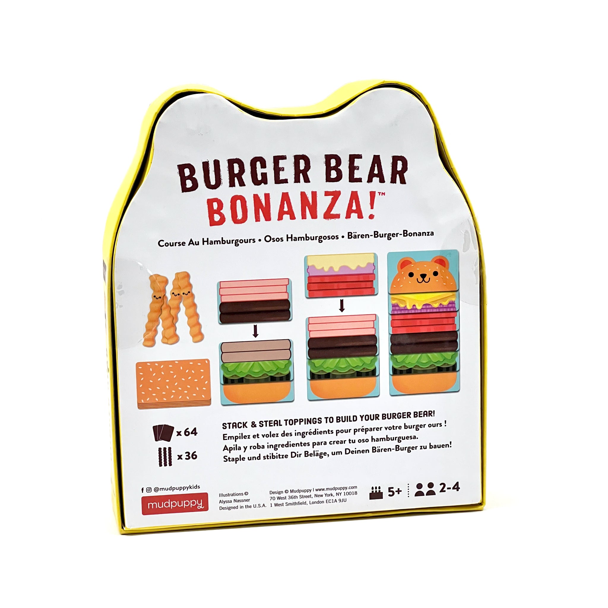 The Burger Bear Bonanza! Game by Mudpuppy offers a delightful challenge for 2-4 players who compete to match, stack, and steal toppings to create burger bears. The first player to build two complete burger bears wins and becomes the champion bear! The set includes 64 cards, 36 french fry tiles, and easy-to-follow instructions. Packaged in a compact, shaped box (6.5 x 7.5 x 1.75 inches), this game meets all CPSIA, ASTM, and CE safety standards and is suitable for children aged 5 and up.