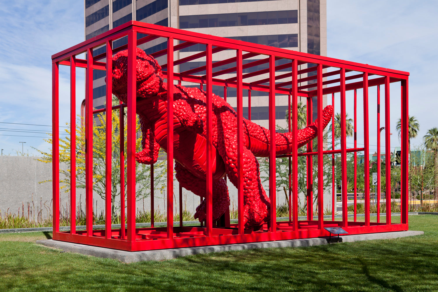 Sui Jianguo’s Jurassic Age (2006) greets all visitors to Phoenix Art Museum and features a large-scale red dinosaur encased in a cage, with the words “Made in China” emblazoned on its belly. This striking installation invites contemplation on globalization, commercialism, and restrictions on freedom. Crafted from bronze, steel, and industrial paint, the piece is part of the artist’s broader exploration of mass production, often referencing the aesthetics of factory-made toys.