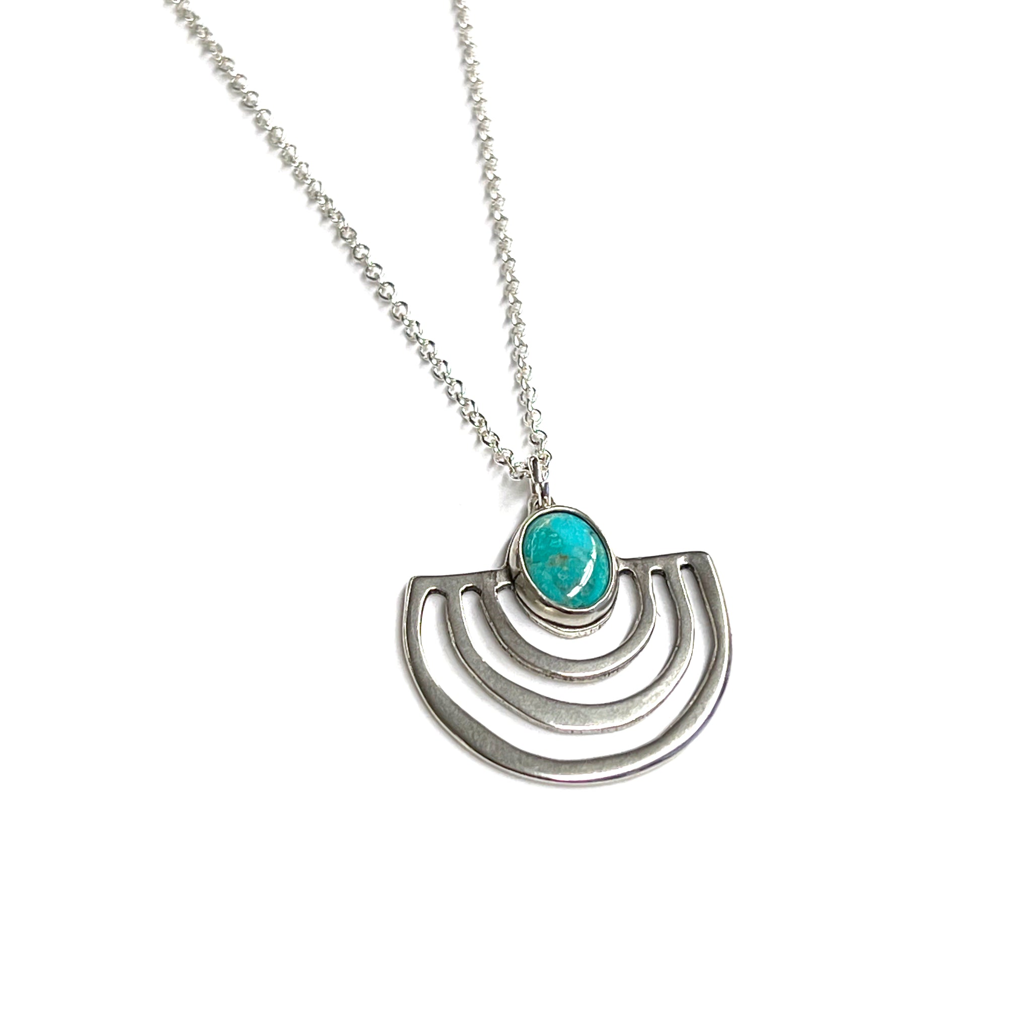 The Halo Necklace showcases three concentric arcs that extend outward from a central oval turquoise stone. Crafted in sterling silver with a smooth polished finish, it highlights the natural beauty of the turquoise, which may exhibit unique color and matrix variations. The necklace includes an 18-inch sterling silver chain for comfortable wear. The pendant measures approximately 7/8 inch wide by 7/8 inch high, making it a subtle yet striking piece in any jewelry collection.