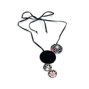 Celebrate the artistry of Japanese tradition with this elegant necklace showcasing authentic Nikoshi Chirimen fabric adorned with the Asanoha pattern. Each circle represents timeless cultural values of wellness, longevity, and safeguarding—symbols deeply rooted in Japanese heritage. The carefully selected fabric speaks to both durability and refined beauty, while the design's circular motifs embody connection and balance. Handcrafted in Japan with thoughtful attention to detail, this 45-inch piece invites you to wear meaningful artistry that honors centuries of cultural wisdom and craftsmanship.