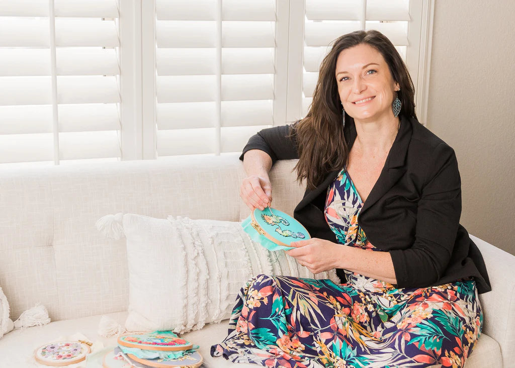 Stitching came into my life after my son was born. I was looking for a way to slow down, ease my anxiety, and create with my hands. I’ve always found peace in art, but the slow, tactile rhythm of needle and thread felt especially calming. It was also much easier to tuck a hoop and floss into the diaper bag than to carry around paints and an easel. My goal is to help my students experience the same joy, relaxation, and fun that I find in hand embroidery.