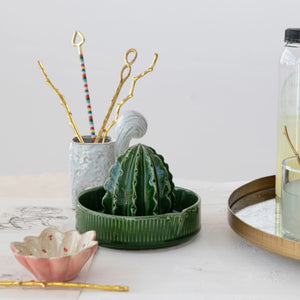 This charming Cactus-Shaped Juicer is expertly crafted from green stoneware, offering both functionality and style. Its 5.75-inch round base and 4-inch height make it a practical size for daily use, while the playful design adds a touch of bohemian flair to the kitchen. Ideal for those who appreciate a mix of farmhouse warmth and eclectic design, this juicer is a conversation starter that also serves up fresh citrus juices with ease. Durable and easy to clean, it's a unique kitchen accessory that combines form with function. Whether for squeezing lemons for a refreshing drink or adding a splash of citrus to various recipes, this juicer is sure to become a staple in the kitchen.